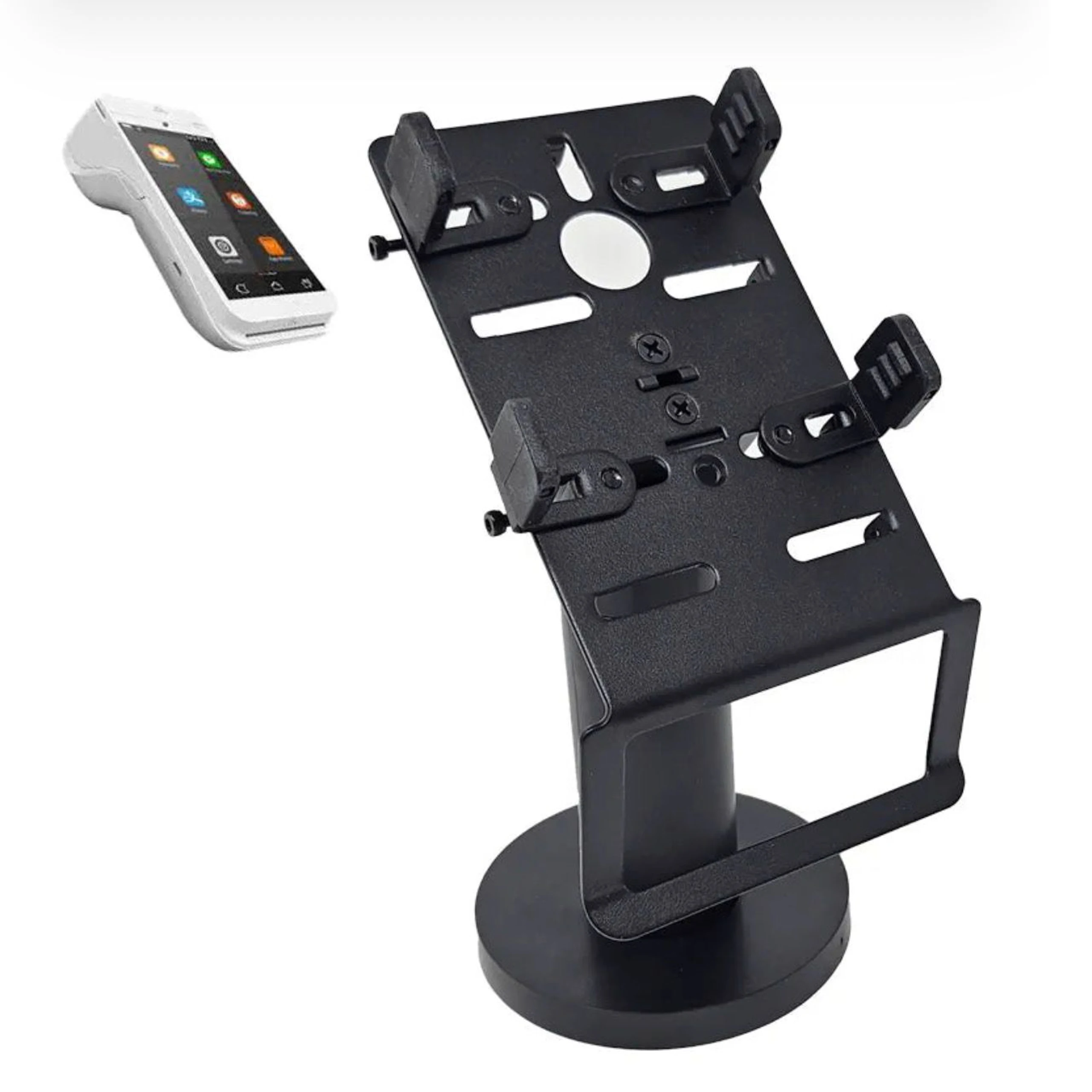 Secure your handheld POS terminal with this professional-grade, adjustable metal stand. Features a 330° swivel and 75° tilt for a seamless customer checkout experience. Compatible with Sunmi, Pax, and generic Android handheld terminals.